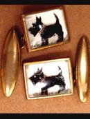Due to a lot of requests from my fellow animal enthusiasts and the yearly Westminster Kennel Club Dog show, I am putting on a few vintage and antique rock crystal reverse painted dog items. This is one of them. You already know that your Champion is worthy of B.O.B. at Westminster! If you buy this, you'll be showing the Judges and the visiting "Dog Fancy," that there was never a doubt that your Terrier would be chosen! Good luck at the "Garden!" You'll have even more confidence in the "Group Ring" sporting these fabulous vintage accouterment !!!!!!!This pair of early antique Scottish terrier, Scottie, cufflinks are signed. Essex crystals, as many labor intensive processes, existed in their purest form, for only a few decades. First seen around the mid 1800s, they faded out toward the turn of the century, and then transformed into a lesser variety of pressed glass as the new century progressed. Rock crystal is painstakingly carved out from the back in an image and finely painted. The back is then sealed with gold, or mother of pearl and when viewed from the front are miniature paintings in three dimensions. Finer pieces entail deep carving and realistic carving as well as superb painting with multitudes of color. You can often judge their value not only but their lifelike qualities, colors but if you turn them to the side, their striking depth. These measure ¾" x ½". On the back they are signed but all I can make out is LT ( photo of mark is included in auction) . These are antique and not new and are very collectible not only to dog lovers but also cufflink collectors.