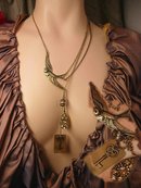 Peridot and amethyst colors in glass drop off this antiques brass chain that has the padlock in the ...