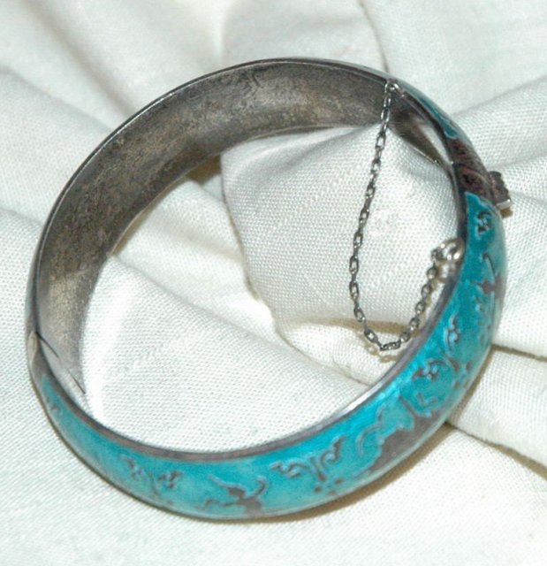 Sterling & blue enamel Siam Sterling hinged bangle. It also has a safety chain. The condition is excellent. There is dark petina on the sterling surfaces.