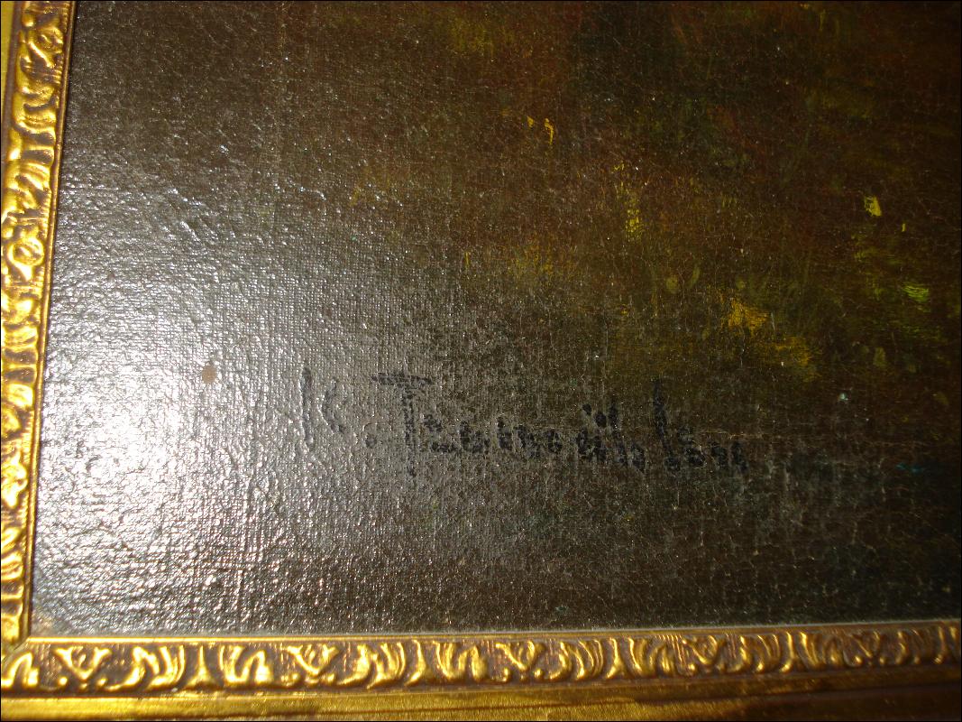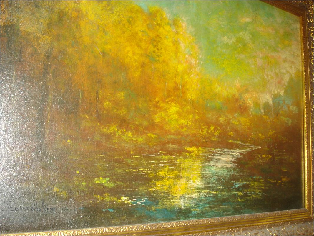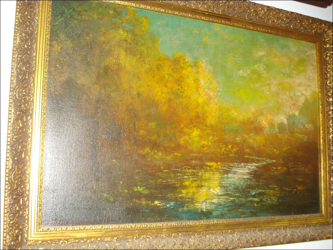 Signed oil on board, illegible signature (see photo), "Impressionist Landscape With Pond", circa late nineteenth century to early first quarter twentieth century.