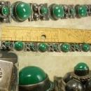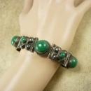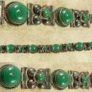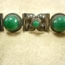 This beautiful old sterling bracelet has green onyx stones in the most unusual settings. The alternating links have hollow designs that hold the raised up stones. The bracelet is hallmarked (I can't make out the initials but I did take a clear photos so you can see it). It measures 7 1/3" x 3/4". It is not a piece that was made over and over again.. It seems to be individual to that time period. THis has not been cleaned and it holds it original patina. It is really heavy and well made and just a fabulous old piece.