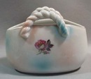 Small Porcelain basket with wild roses design by Thames. Great little basket with rope type handles. Will make a beautiful planter. Handpaint & decal floral design with hints of pink & blue all around the basket. Very lovely,4 1/2 x 3 1/4"