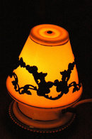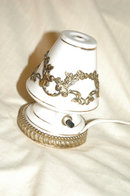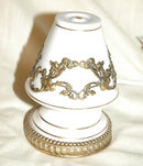 The outside of the porcelain is decorated with gold tone metal flowers and vines. The porcelain unit is attached to a gold tone metal base ring.