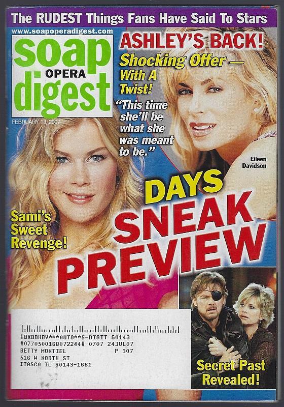 Soap Opera Digest Magazine February 13, 2007. Days Sneak Preview on the Cover. Articles inside include Sami Gets Revenge, Tad Martin, Ilene Kristen, Austin Peck and more. Filled with Photographs of your favorite Soap stars and vintage advertising. Magazine is in good condition, wear at edges