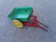 Red painted flat bed style heavy duty solid wood truck semi trailer toy from the 1960's to 1970's. Rifton New York Community embedded mark. Solid black plastic wheels, steel axels, chrome coated metal hubs & headlights.