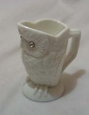 Sparkler owl mini creamer, poinsettia leaves on back & well defined feet & feathers. This looks like the Westmoreland owl, but there are not marks. It is a older piece of glass. Mint condition, Aprox 3 1/2 x 2" not including handle.