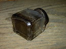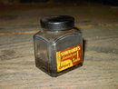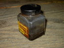 STAFFORD'S fountain pen type glass ink bottle rectangular shaped storage jar. Black painted tin screw style lid, yellow & brown paper label. Raised diamond 84 4 bottom mark.