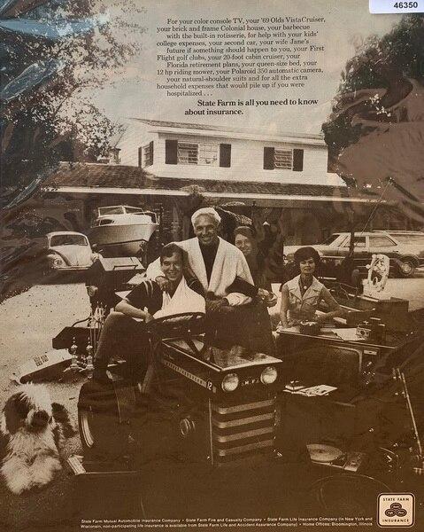 State Farm Insurance 1970 Ad. This black and white May 15, 1970 ad states For your color console TV, Your 69 Olds Vista Cruiser, your brick and frame Colonial house, your Barbecue with the built in rotisserie. State Farm is all you need to know about Insurance. Picture shows man, woman, boy and girl in front of house with Two cars, Boat, Lawn Tractor, TV, Piano and more household items. Magazine tear sheet picture is taken through plastic and may show wrinkles or crookedness that is not in the ad. This original magazine tear sheet measures 10 inches wide by 13 inches tall