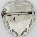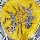 This sterling silver shield shaped pin is in the Siam Niello style. The center of the heart shaped shield is covered in yellow enamel and it has two dancers in the middle. The back of the pin is stamped Siam Sterling.