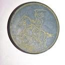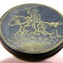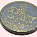 Casino gambling chip with a horse rider, sword, cowboy hat and rope decoration. Both side has the same display.