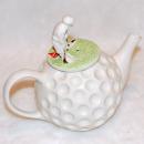 Sunshine Ceramics Cardew "TEE 4 TWO" Gold Theme Teapot made in England , RARE. The finial is a man set to T-off on the green. The body of the pot is shapped like golf ball. The condition is excellent. It is 8" tall and 8" wide.