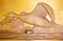 Offering this large vintage Syroco Wood tie or belt rack with a three dimensional duck in flight seen in the backround, on the part that is designed to be attached to a wall or door. The rack measures 10.5 inches long x 5 inches tall, and has a bar that stretches across the front to hold the neck ties or belts in one of two area that are about 4" wide. Very good condition, no cracks or chips, a couple tiny wear spots on the rail across the front. A very handsome piece for your dressing closet.
