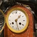 Cleaned since its acquisition by our client, it is in good condition. There are chip losses to the corners of the marble, oxidation to the bronze finishes, rubbing wear and scratches, and a break to the bronze wreath applied to the front face. The suspension spring for the pendulum is missing, and the pendulum may have been replaced. There is no key. An horologist may certainly return the clock to proper working order.