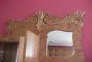 This is a tiger oak secretary bookcase combination. It is made from american quarter sawn oak and has applied carvings with griffins / lions heads on left and right of crest. The bookcase / curio section has a curved glass door and four adjustable shelves. There is the original shaped beveled mirror above the desk area. The drop lid has applied carvings and inside are the original cubbies and a drawer. There are three drawers below the secretary area. The desk has its original hardware. Email any questions or for shipping quotes. Thanks.