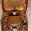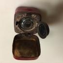 This particular piece is a really neat antique traveling inkwell. It is made of brass and then is covered in red leather. On the top of the lid it is stamped INK and on the front is a hidden button that opens the lid. Under the main lid is a second lid with some great engraving details. That lid protects the actual ink bottle. The ink bottle insert is original and included. It measures about 1½" square and is in great condition – leather is very clean!. Very nice and very old piece dating to the late 1800s. Buyer pays S.+ H. "We accept Visa, MasterCard, Discover and American Express via Paypal.