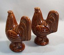 USA Rooster Salt & Pepper Shakers. This is a pair of brown rooster salt and pepper shakers. They are marked USA. They are Pottery. They have rubber corks. Lots of detail on these. Very nice. In mint condition and probably from the 1970's. They measure 4" wide and 5 1/2" high. Please Note picture may be larger than actual size.
