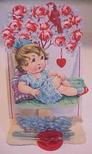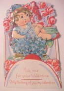 Offering this beautiful larger size fold out valentine, circa 1910-20's; decorative cutout flap with the words Pick Me for your Valentine Only thinking of you, My Valentine, folds out to show a red honeycomb rosette, and three layer decoration - first layer is a colorful bouquet of forget-me-nots; second layer is an adorable little girl in blue, the third layer is a large tree with red roses, blue leaves and a robin. Measures 5 3/4 x 3 3/4 inches, very good condition, no holes, tears, or stains, no writing, never used; no markings as to maker. Light age toning on back side. The artwork on this one is just wonderful, all the delicate cutouts and the colors are so bright. A beautiful addition to your collection or a wonderful vintage valentine gift!