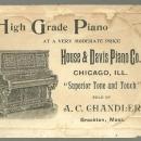 Victorian Die Cut Trade Card for House and Davis Piano Co., Chicago, Illinois. Sold by A. C. Chandler, Brockton, Mass. On the Front of the card is a Lovely Lady. Back of card has information. Card is in good condition, wear at edges, glue stains on back. Card is 5" high and 3 1/4" across.