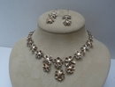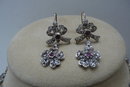 Beautiful Victorian Gold and Silver Necklace and earrings with Rubies and Diamonds. During the Victorian period there was no white gold and platinum wasn't really used in jewelry till the 20th century, so silver was added to the gold to create the white background. It is a charming and feminine and romantic set. It is in excellent condition with all the stones in tact. the necklace measures a little over 15". The earrings are 1 1/4" long and 3/4" at the widest part.