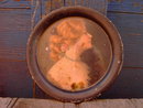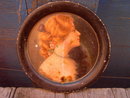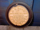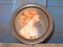 Beautiful Victorian lady portrait coaster small tin decorative plate. Copyrighted 1907 By The Meek Company. C K Ross Tipton Kansas Ross' Corn Harvester gold embossed backside paper label emblem. "Do Not Send Your Orders Out Of Town Tipton Needs Your Business At Least I Do. If Its Made & In My Line I Have It Or Will Get It For You".