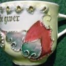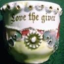Fancy motto cup/mug with "Love the Giver" inscription. Gold encrusted; hand painted yellow-green luster. Made in Germany, though mark has been scratched out (often the result of anti-German sentiment during the first world war); late 1800's-early 1900's. Measures 31/8"h x 3 1/2"d. No chips or cracks. Sold as is. Inglenook Antiques...Established 1989.