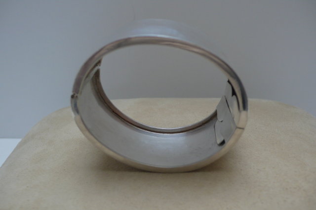 Victorian sterling silver bangle in excellent condition. It measures 1 1/4" wide. It has an inner diameter of 2 1/8" x 1 3/4". This bangle has a wonderfully charming etched design with brids and flowers and swirls.