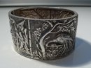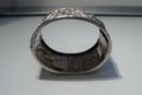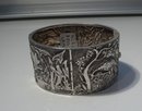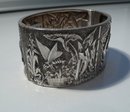 Beautiful and bold Sterling Silver Bangle with powerful etching all around the bangle. It is birds and flowers and lush scenes. It measures 1 1/4" wide and the inner diameter is 2 1/4" x 1 3/4". It is a fabulous and unusual look in excellent condition.