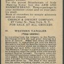 Victorian Trade Card for Arm and Hammer and Church and Co. Baking Soda. Useful Birds of America Series. Western Tanager Third Series #15. Front of Card shows the Bird and back of card has information about the series, Arm and Hammer Baking Soda and about the Bird. Card is 3" high and 2" across. Good condition, wear at edges.