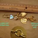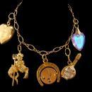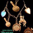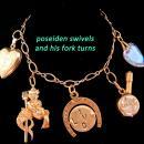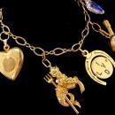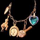 This vintage 12kt gold filled chain holds a large neptune charm that not only spins but his form moves as well ( really well made). There are other unusual charms on the bracelet at well including a locket, liquor bottle and glass heart charm.