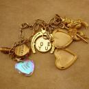 Vintage 12kt gold filled Bracelet - large neptune poseidon spinning charm - heart locket - swarovski letter M glass heart