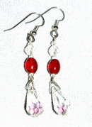 Lovely hand crafted 2 5/8" dangle drop earrings. The faceted AB tear drop crystal bead and the bicone crystal is from a vintage necklace that I took apart. The center bead is a transluscent red czech bead . The findings are of silvertone metal. The ear wires are of stainless steel.