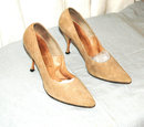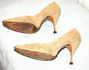 Lovely vintage pierced suede leather high heal pumps. The size is marked as 7 1/2 B The pattern is all over the front and outer side of the shoe and the first ½ of the inner side. The pattern reminds me of lattice work. They fairly pointy with a skinny heal. The leather is soft and supple.