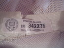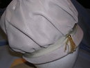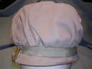 Lovely Vintage Beige or Bone Velvet hat with gross-grain ribbon band and gold metal tassel. The inside is lined with a stiffen mesh to hold the puff on the top. Label reads Union made BR342275, Made in the USA. Hat is in excellent condition.