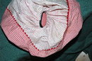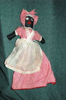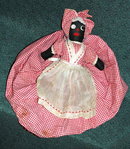 Very old hand crafted black mammy doll. Her dress is red checked. She has brick a brack on the bottom on her dress. PLus she has embroidery stitches on her apron. She has a tuft of white yarn hair poking out from the bonnet.
