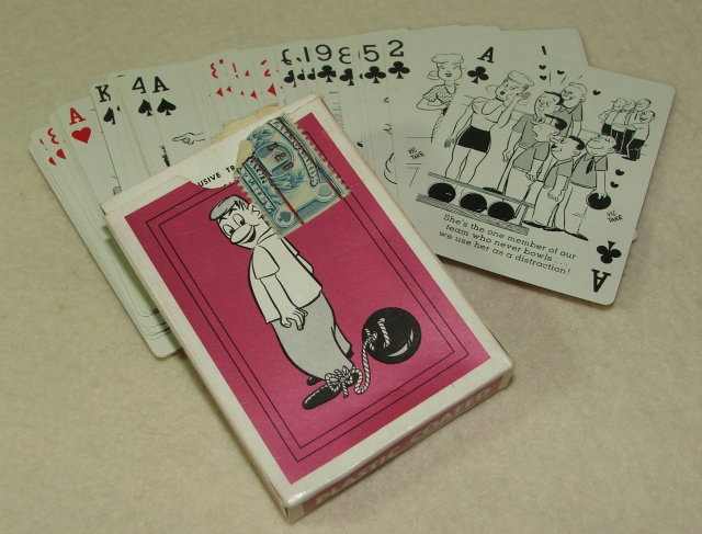 Vintage "Bowl-Up" plastic coated playing cards, circa 1950's, featuring "52 hilarious cartoons". These delightful cards are deep pink with a cartoon bowler tied to a bowling ball on the back side, and a black and white cartoon on the front of the playing card. The artwork on all cards is done by Vic Take. There are 52 playing cards, a joker, and an extra joker. The cards come in their own box which still has the original tax stamp. The cards, which were produced by the Creative Playing Card Co., Inc. of St. Louis 2, Missouri, are in pristine condition and look like they have never been used. The box shows more wear but is intact and clean. Please refer to the 4 photographs for appearance and condition. Shipping / packaging / handling will be $6.00.