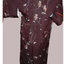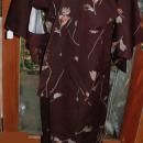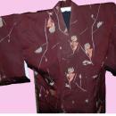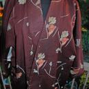 Vintage brown kimono with pinkish shade flowers. It is very old and has a silk lining. The outer fabric could be a all silk or rayon silk blend I can't determine this for sure. There looks like a stain on the front from being ironed on to high of heat. There are a few other imperfections. Nice old kimono however. It is an medium size.