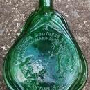 Vintage Clevenger Brothers blown-in-mold commemorative flask of Camden Maine. Dates from around the 1950s-70s. Marked on bottom. Measures 7"h x 5"w x 1.5" deep. Emerald green with slightly iridescent finish. Reverse side design of glass blowers. Nice condition with no chips or cracks. Inglenook Antiques...Established 1989.
