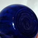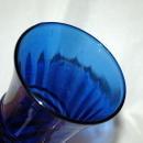 vintage cobalt blue glass vase. It is 6.75" tall. The bulbed portion at the bottom has a vertical pattern that projects out on the inside and the outer side if smooth. There are 3 rings in the mid section the flared top has swirled lines with the ths same texture.