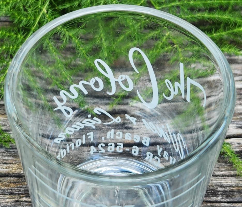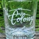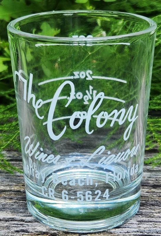 Mid-Century advertising bar measure glass with white graphics. Made for "The Colony Wines & Liquors" of Delray Beach, Florida, perhaps part of the resort by the same name. Holds 3 ounces. Measures 3 1/8"h x 2 1/4"d. No chips or cracks; very little wear to logo. Inglenook Antiques...Established 1989.