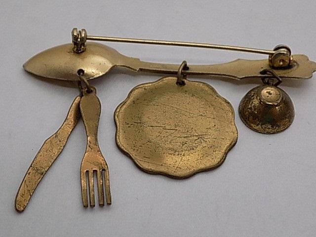 Vintage Coro Teaspoon with Cup, Fork, Knife & Enamel Plate Charms Brooch Pin. It is darling and in very good condition for age. Has a few tarnished spots on the brass here and there and more son on the back but nothing to detract from it.