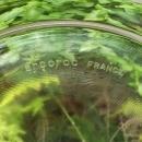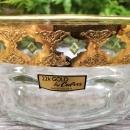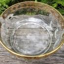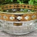 Mid-century modern "Valencia" glass bowl, decorated by Culver, circa 1962+. Arcoroc, France blank, signed on bottom. Green diamonds and 22 karat gold decoration on clear. Measures 8.75"d x 3.875"h. Considered a salad bowl, but can be used for anything you like. Excellent unused condition with original label intact. Inglenook Antiques...Established 1989.