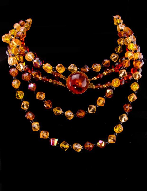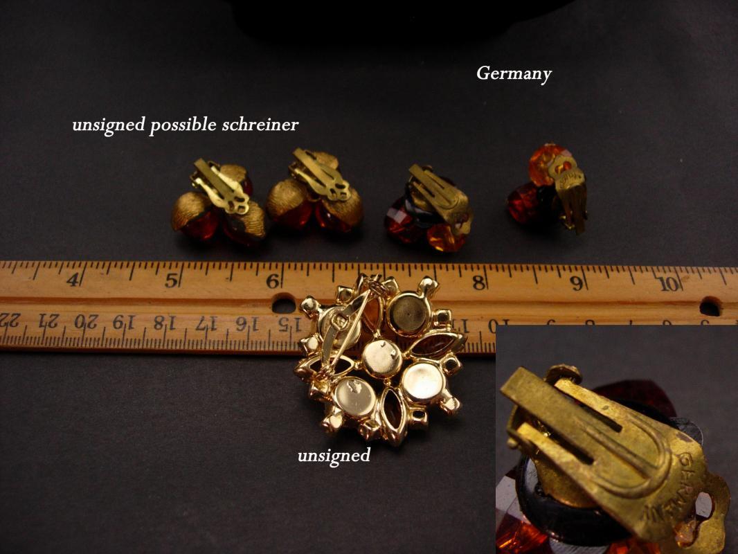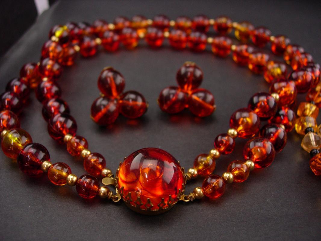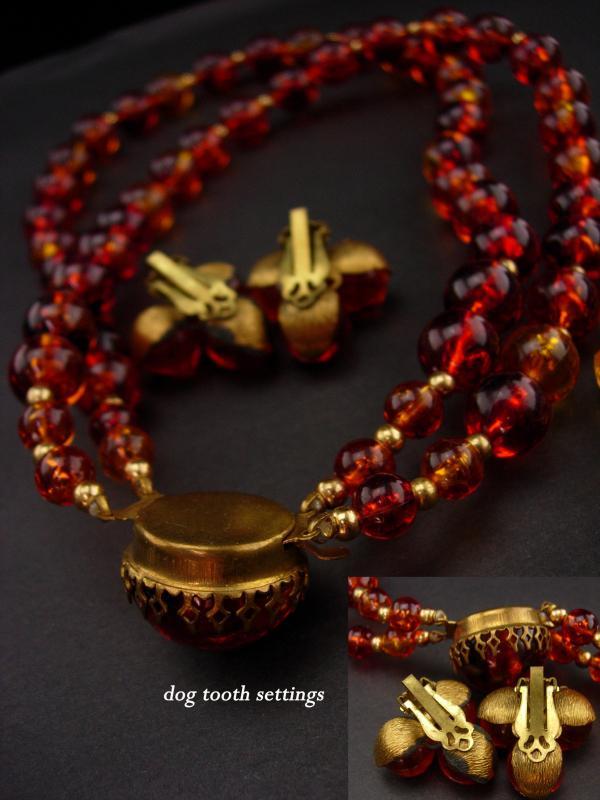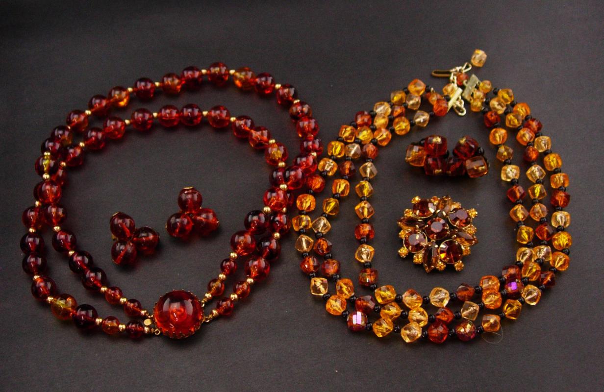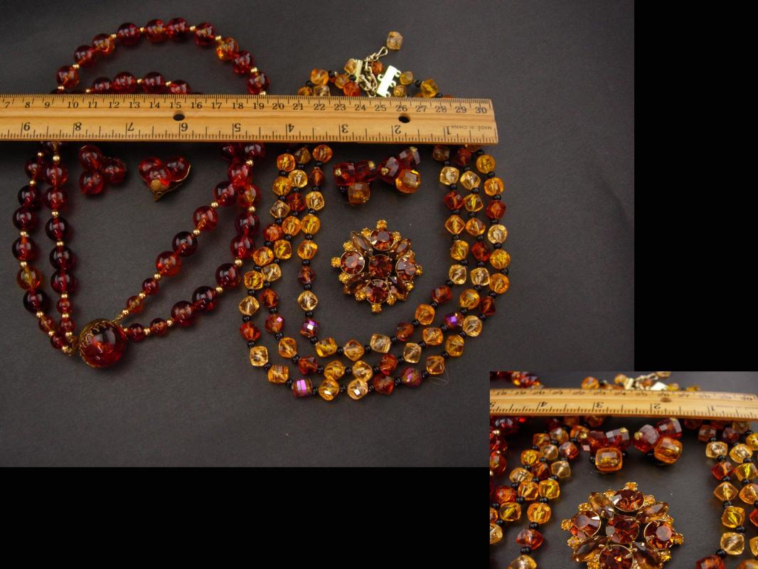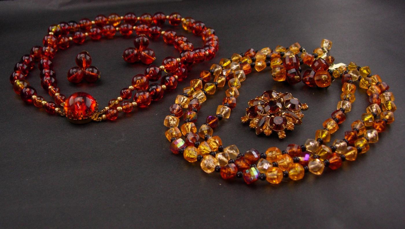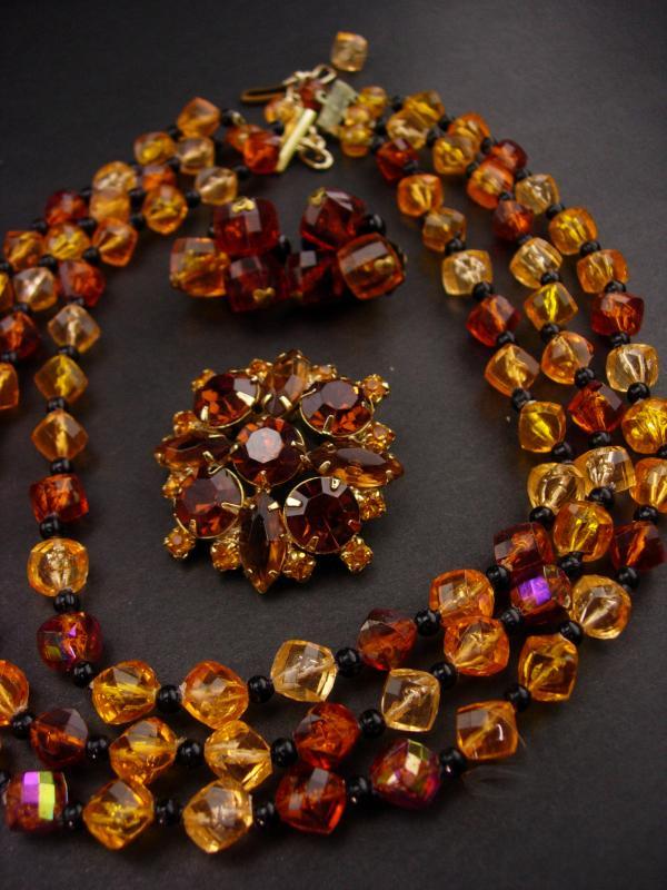 Rich fall colors of orange and sparkles of rhinestones make these 1950's lucite sets quite attractive. Notice the dogtooth setting that is a trait of Schreiner on the one necklace. The large thick cluster brooch has lots of rhinestones An added bonus.
