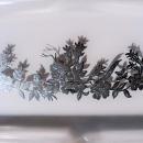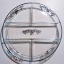 Sterling silver overlay 5-part relish tray in the "Wild Rose" pattern by Duncan & Miller. Marked "Sterling" inside one of the leaves, as shown. Heavy glass, measures 12.75"d x 1.25"h. Nice condition with no chips or cracks. Due to the weight of the item, please contact me for shipping cost. Inglenook Antiques...Established 1989.