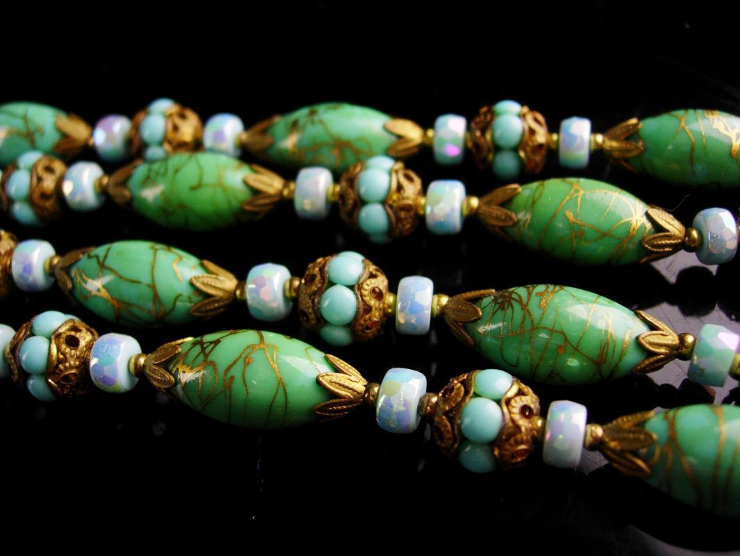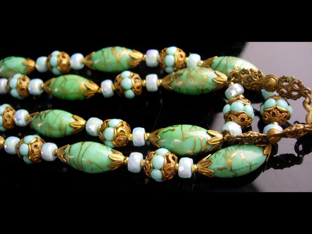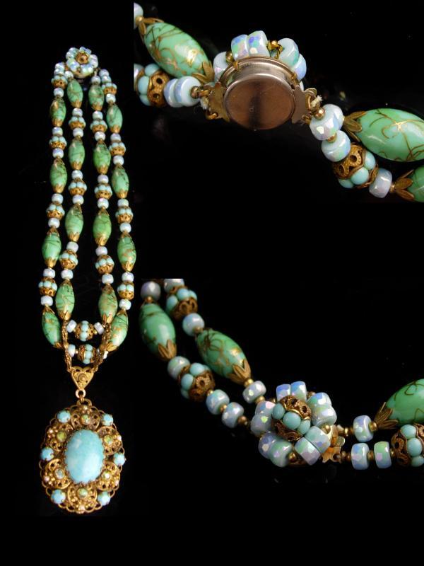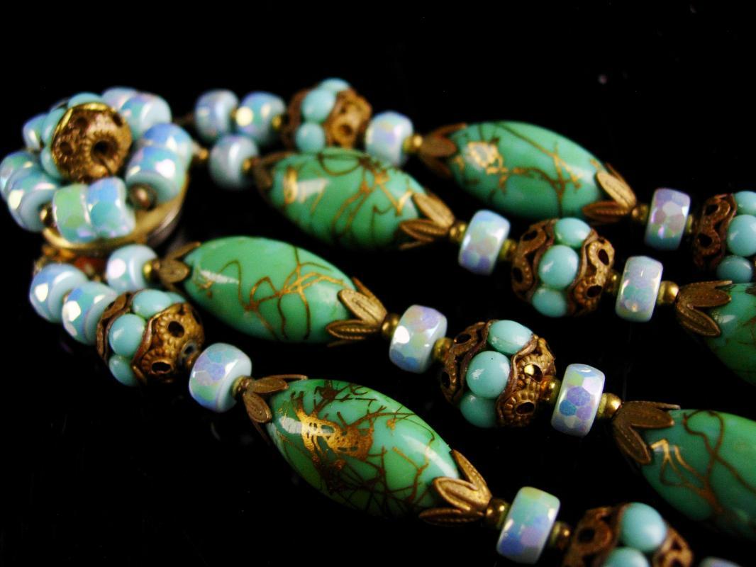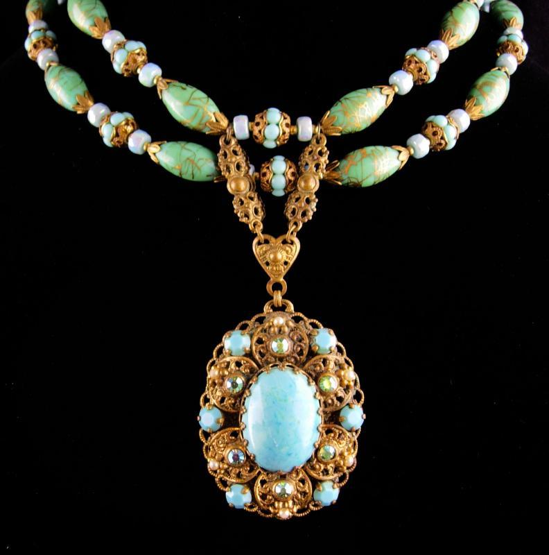 This fabulous Glass necklace has the most exotic colors of turquoise and gold. When I saw this vintage 2 strand necklace I just new these two needed to be together forever. The colors are beautiful and almost like the bahama waters. The Edwardian feel makes this one of a kind necklace a real treasure! . The assemblage necklace measures 15" long on the shortest strand when closed. Even prettier in person this necklace has such a variety fo fabulous vintage beads it makes is a work of art.