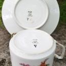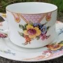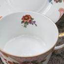 Fine china flat cup & saucer in the "Bridal Rose" pattern #5522, made by Epiag of Czechoslovakia. Circa 1930's. Cup measures 2.25"h; saucer 6"d. Metallic gold rim. No chips or cracks with very little surface wear, except for some gold loss, as shown. Sold as is. Have 4, priced separately, but happy to combine shipping. Contact me before ordering. See our other listings in this pattern! Inglenook Antiques...Established 1989.