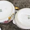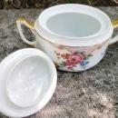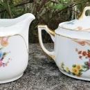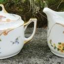 Fine china creamer and sugar with lid in the "Bridal Rose" pattern #5522, made by Epiag of Czechoslovakia. Circa 1930's. Creamer measures 5 1/2"l x 3 1/8"h; sugar 6 7/8" handle-to-handle x 4"h. Metallic gold rim. No chips or cracks with very little surface wear, except for some gold loss, as shown. Sold as is, and as a set. See our other listings in this pattern! Inglenook Antiques...Established 1989.