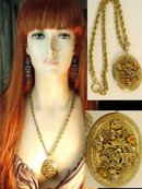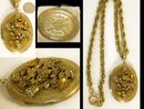 Golden glass jewels and tiny seed pearls embedded into layers of vines and flowers make this huge ( 2") locket quite beautiful! The thick gold filled chain measures 24" long and has pretty raised relief designs on the large links. The locket opens up and has a metal frame that comes out so you can place your photo under it. The necklace is in very good condition and is one the fanciest I have seen in a long time. Earrings in photo are not included.
