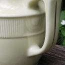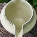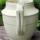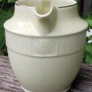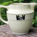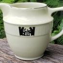 "Silhouette" pitcher or jug on the Medallion shape, made by Hall China Co., circa 1935. Holds 40 ounces, and measures 5.75"h at lip. Black image of two gents eating and smoking, shown on both sides, with platinum trim. Very good condition with no chips or cracks, very little wear. Inglenook Antiques...Established 1989.