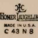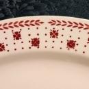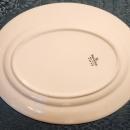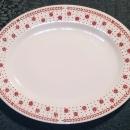 Restaurant ware platter in maroon red border pattern of flowers, dots, and laurel garland, by Homer Laughlin. March 1943 date code. Measures 9" x 11 5/8" oval. No chips or cracks, moderate surface wear. Sold as is. Inglenook Antiques...Established 1989.