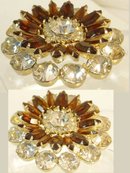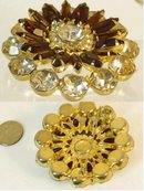 This very beautiful vintage brooch is really heavy and well made and is done in layers that make this look like a real flower just picked from the garden. Not a reproduction, this early piece is most likely from a well know costume jewelry manufacture because the quality of this and the design is so very intricate. This measures 2 1/4" across and is almost 3/4" thick. Full of vintage heavy glass stones this is quite the piece when you see it in person! Since this is Irreplaceable there can be no returns on this sale.